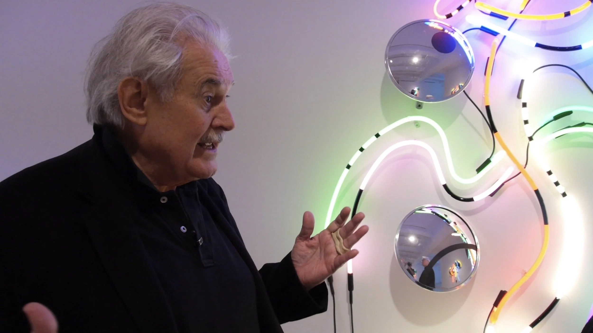 Filmed at several locations, Sonnier takes us from an auto-body shop explaining the transformation of a 1950’s Oldsmobile into neon work, then to his Bridgehampton studio discussing his work process from sketches and maquettes into neon art pieces. Next we see Sonnier at his exhibition at the Pace Gallery where he carries on a dialog with director Douglas Baxter. The last segment invites us to the exhibition at the Parrish Museum where he reminisces and recounts influences on his earlier works and his childhood. Finally a site specific neon work that floats and dances on the hallway ceiling like sky writing.